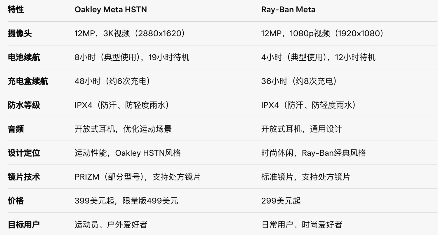 - Meta与运动品牌Oakley强强联手,🎉隆重推出了Oakley Meta HSTN智能运动眼镜!😎 这款眼镜将尖端AI技术融入运动设计,简直是为运动员量身定制的未来装备。它不仅有AI助手、3K高清摄像和音频播放功能,还能实时分析你的运动数据,给你带来前所未有的体验!🚀 而且它还具备IPX4防水等级和长达8小时续航的超强耐力。限量版将于7月11日开启预售,普通版随后在美国、加拿大、欧洲等地发售,售价分别为499美元和399美元。准备好迎接你的运动新搭档了吗?