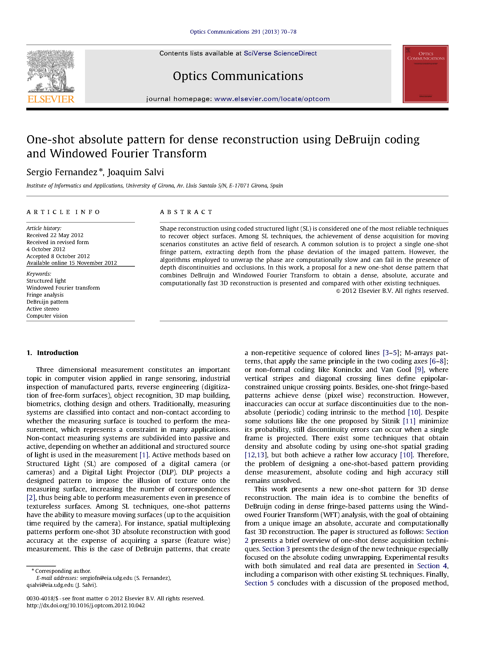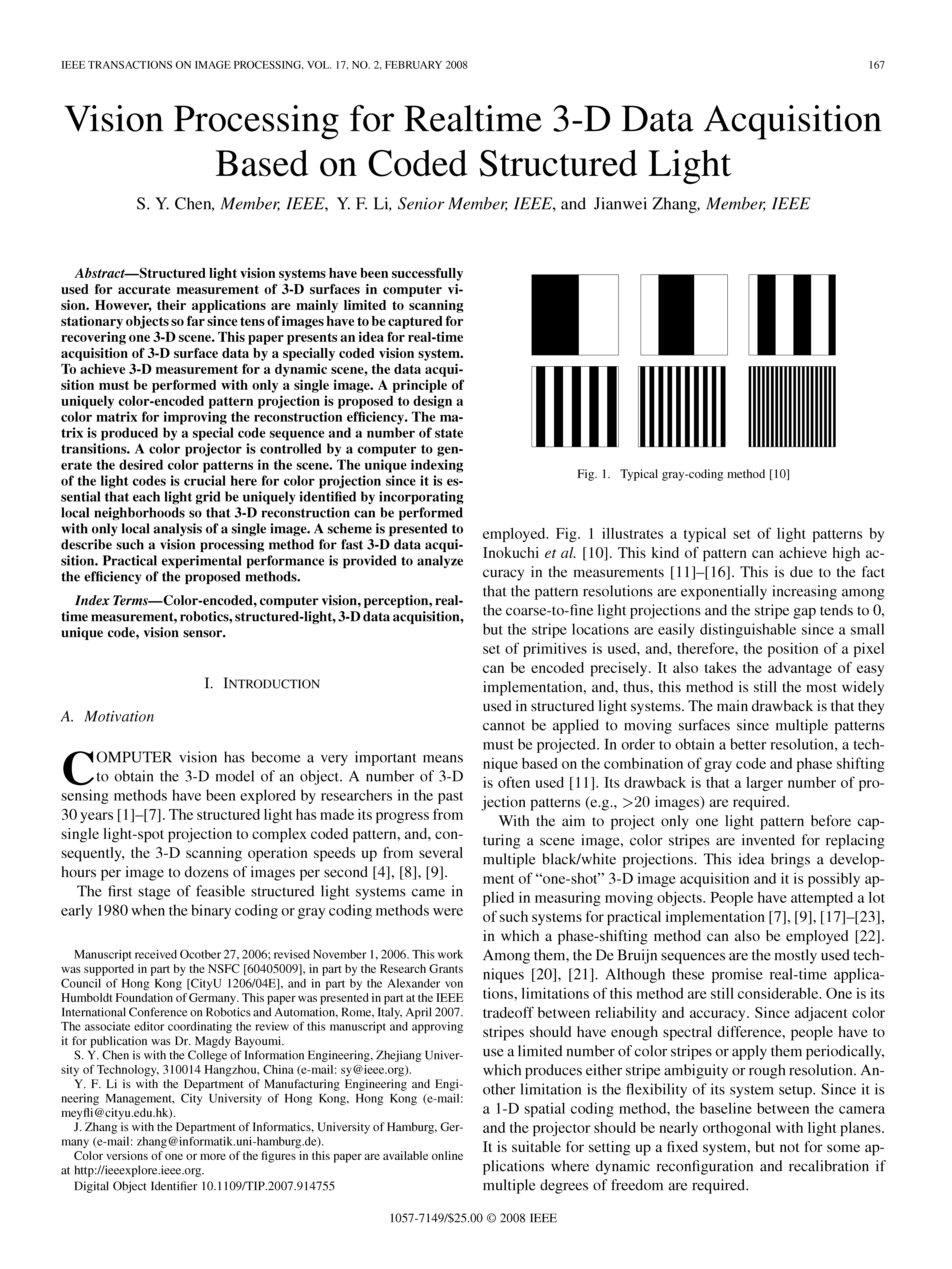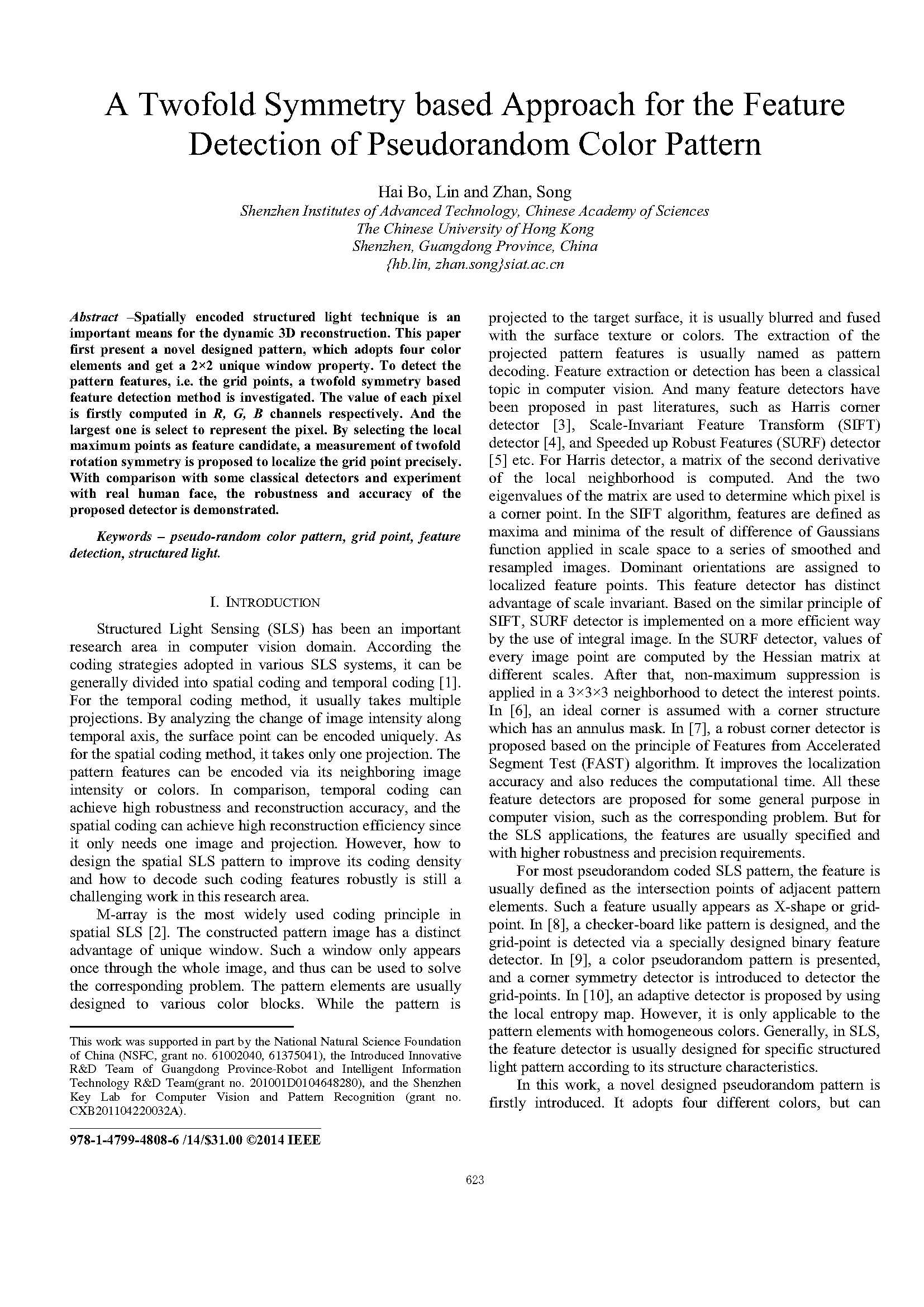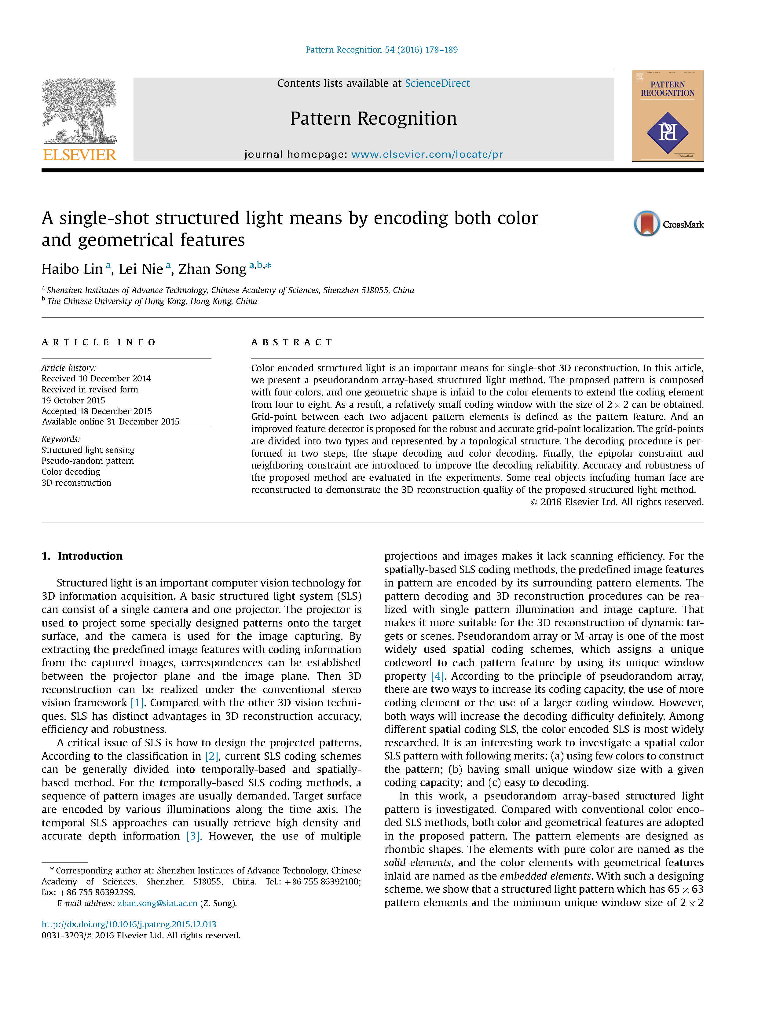 De Bruijn 序列由n种不同元素构成,任意长度为m的连续子序列只出现一次。复现的论文以 B(3,4) 序列进行编码,条纹作为结构光编码图案的基本元素,红、蓝、绿三种颜色作为标记条纹代表的不同数值,窗口大小为 4*1,以条纹中心点作为特征点。同时在 HSV 颜色空间模型中,以余弦函数对条纹的 V 通道进行编码。在结构光解码时,除了提取条纹中心点作为特征点,同时对拍摄到的图像的 V 通道进行加窗傅里叶变换分析,通过分析得到的相位进而增加特征点的密度。根据论文的基本思路,可在提高提取点云进度的同时增加点云的稠密度,实验效果较好。根据项目内容和有关研究的进展,在研究论文和实验的基础上,对复现论文的算法进行改进,提出适合项目场景的算法流程。部分论文如下。