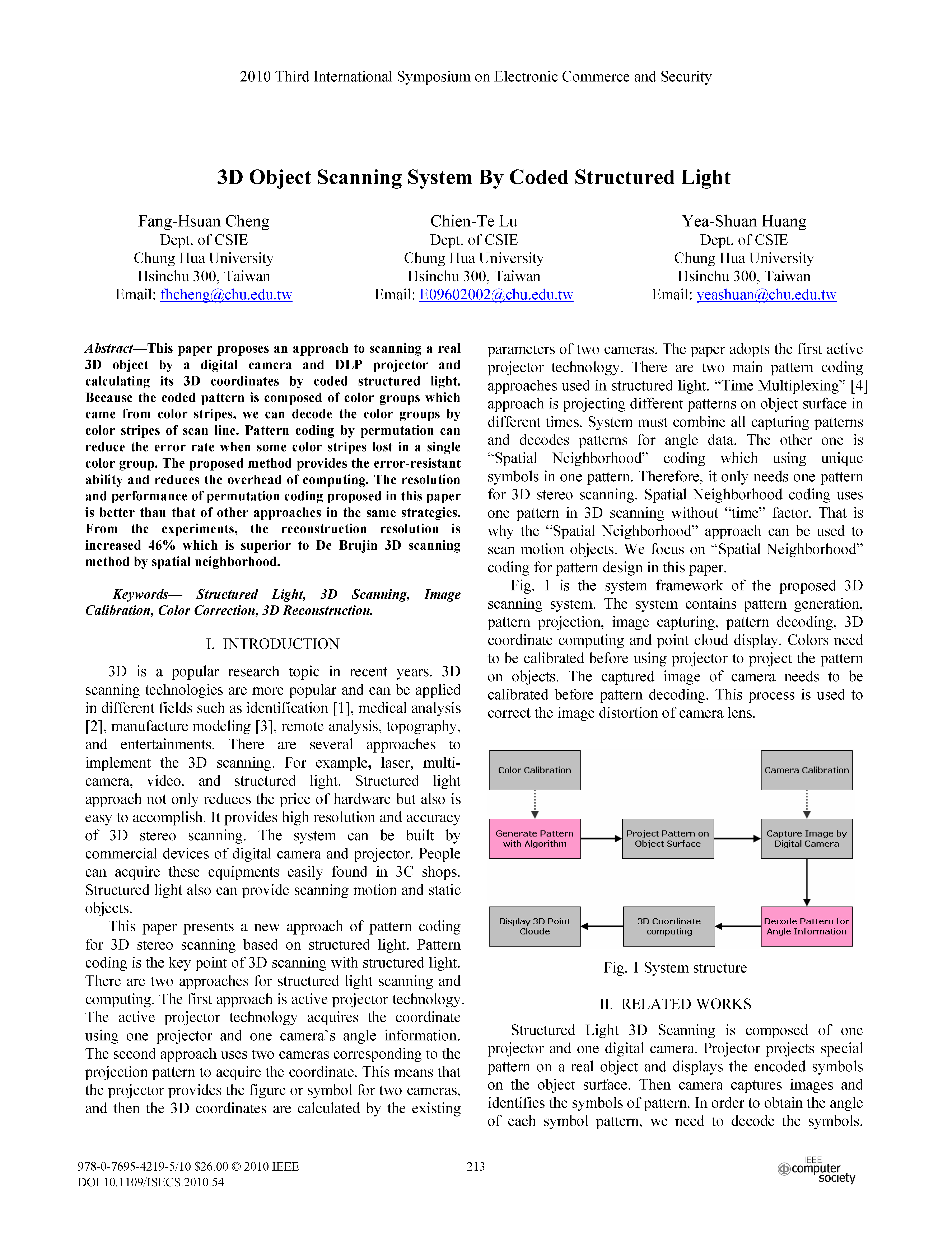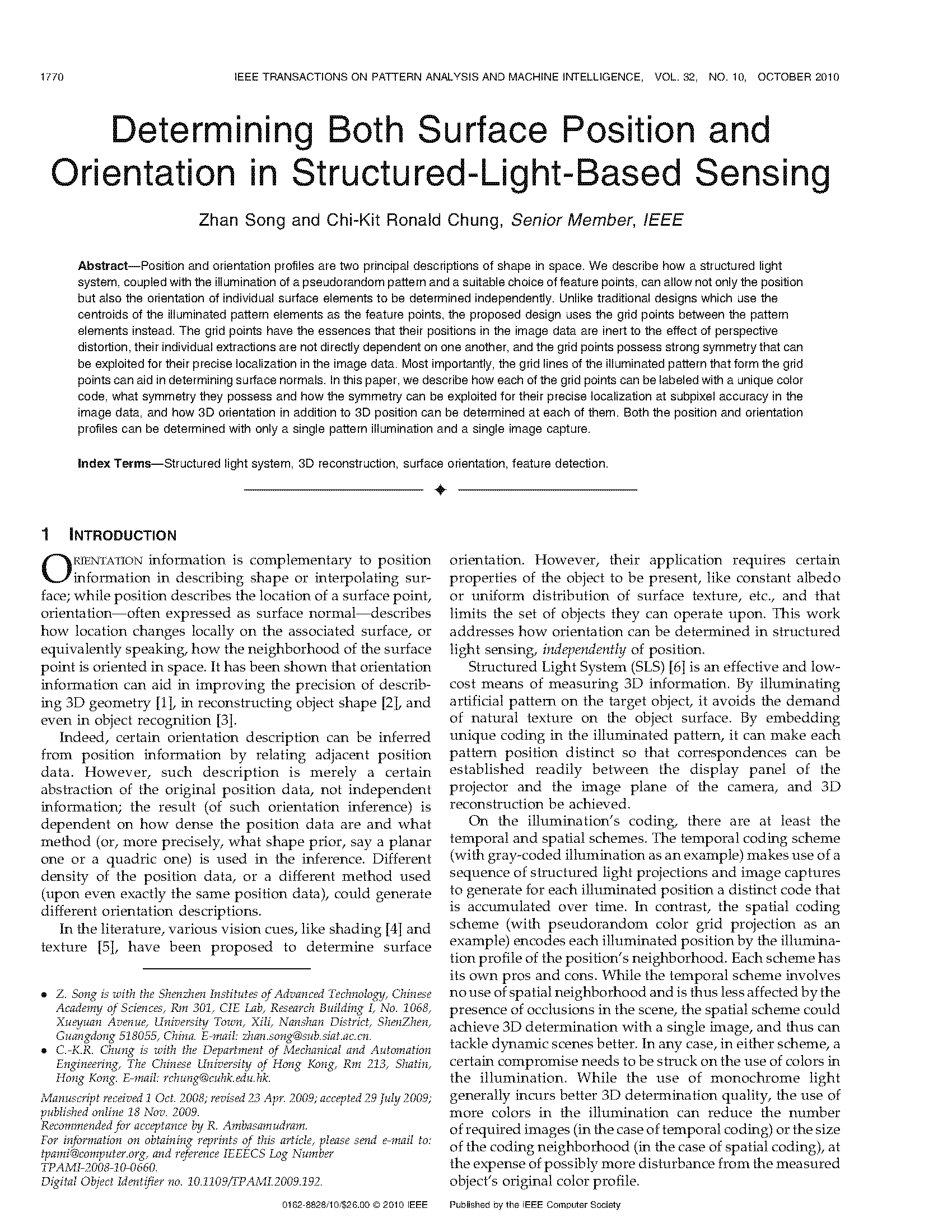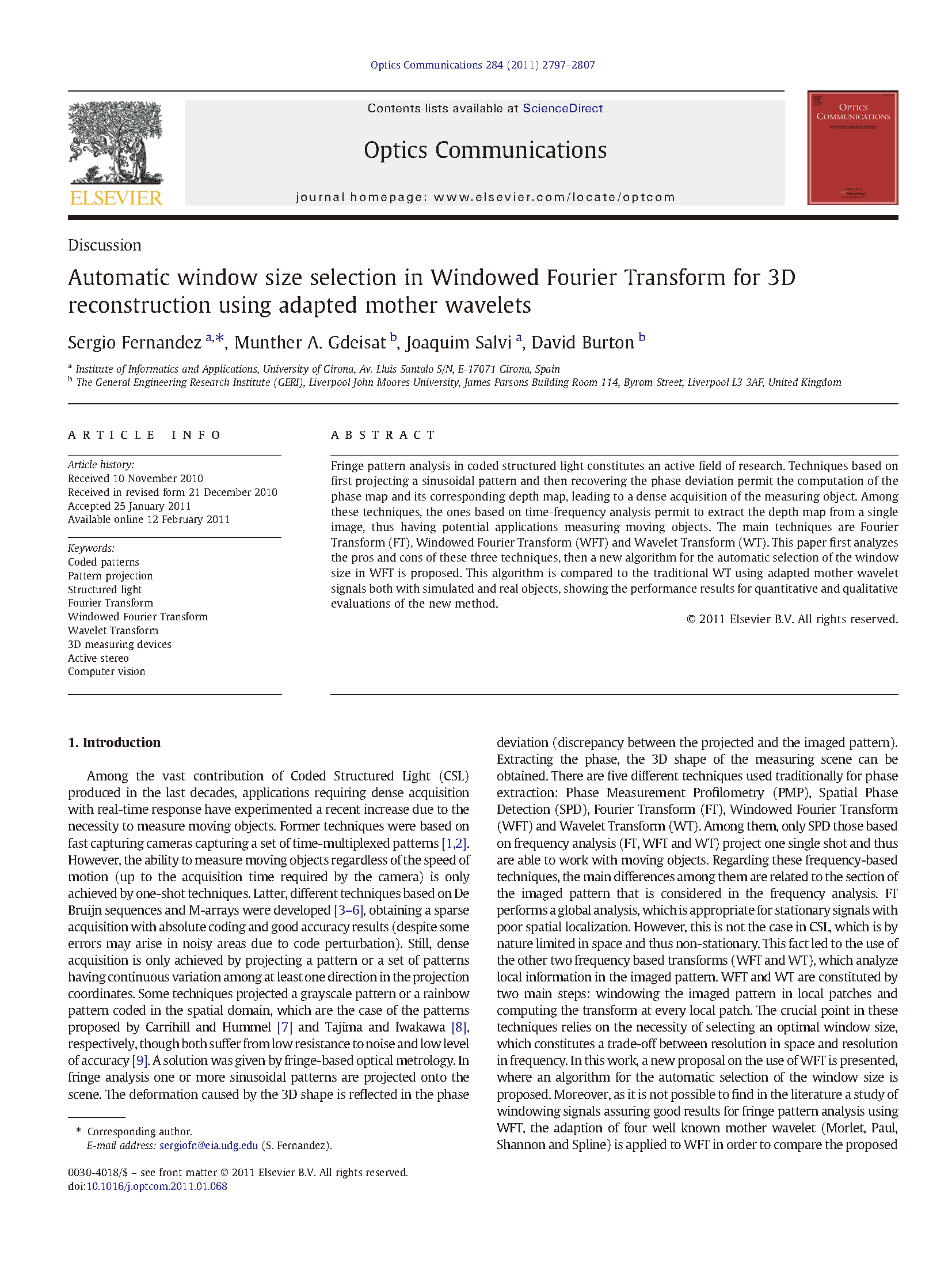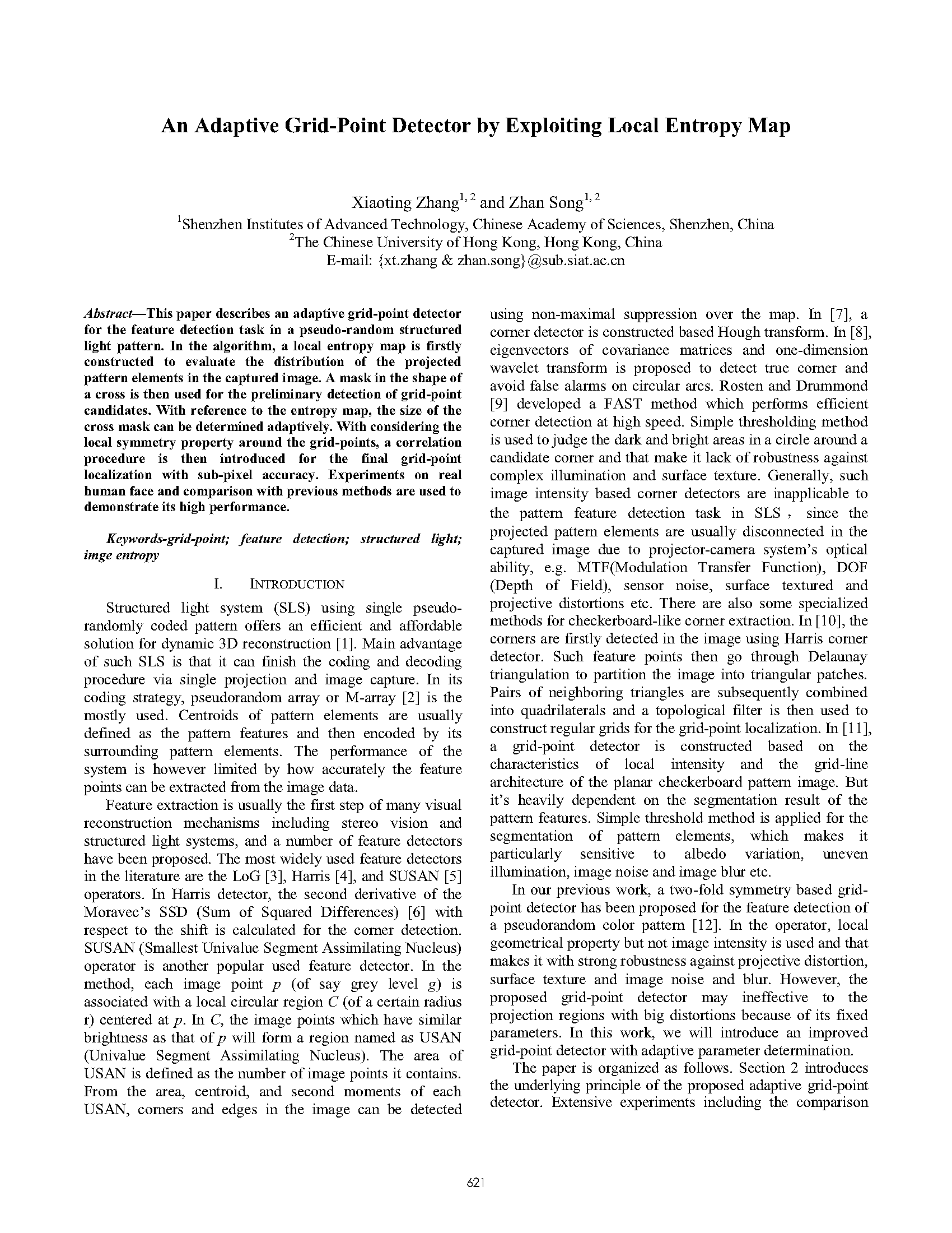 De Bruijn 序列由n种不同元素构成,任意长度为m的连续子序列只出现一次。复现的论文以 B(3,4) 序列进行编码,条纹作为结构光编码图案的基本元素,红、蓝、绿三种颜色作为标记条纹代表的不同数值,窗口大小为 4*1,以条纹中心点作为特征点。同时在 HSV 颜色空间模型中,以余弦函数对条纹的 V 通道进行编码。在结构光解码时,除了提取条纹中心点作为特征点,同时对拍摄到的图像的 V 通道进行加窗傅里叶变换分析,通过分析得到的相位进而增加特征点的密度。根据论文的基本思路,可在提高提取点云进度的同时增加点云的稠密度,实验效果较好。根据项目内容和有关研究的进展,在研究论文和实验的基础上,对复现论文的算法进行改进,提出适合项目场景的算法流程。部分论文如下。