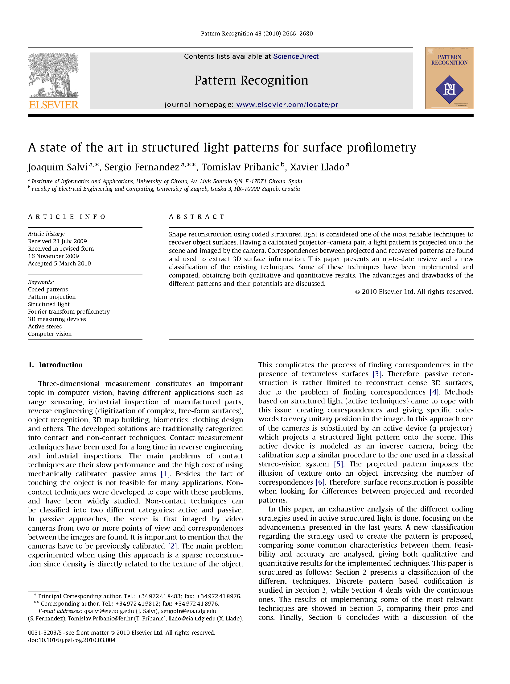 当物体表面相对光滑时,物体的特征不易提取,点云重建精度较差。而基于编码结构光的重建方法可以向物体表面投射编码图案从而增加物体表面的特征,获得较好的点云重建结果。编码结构光三维重建技术主要由图像获取、结构光编码、结构光解码、系统标定和三维坐标计算等5个关键技术组成。