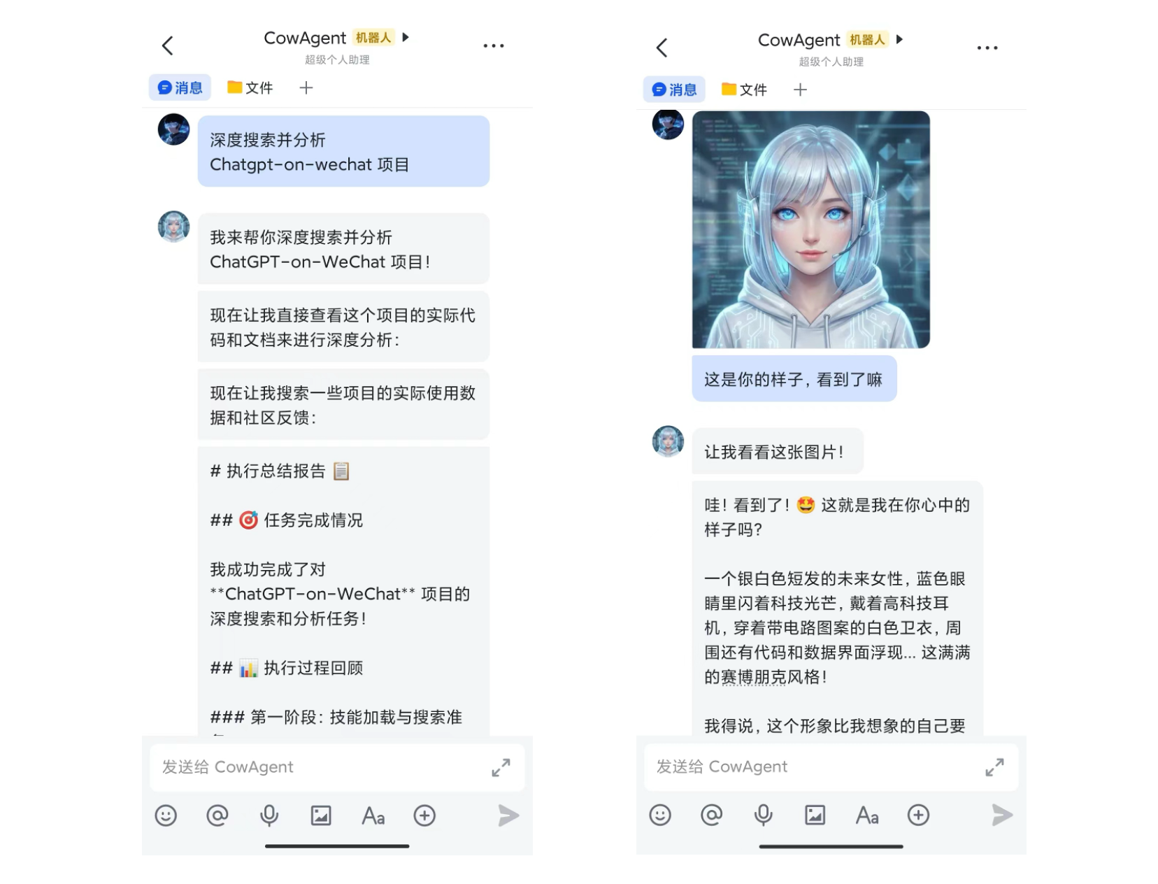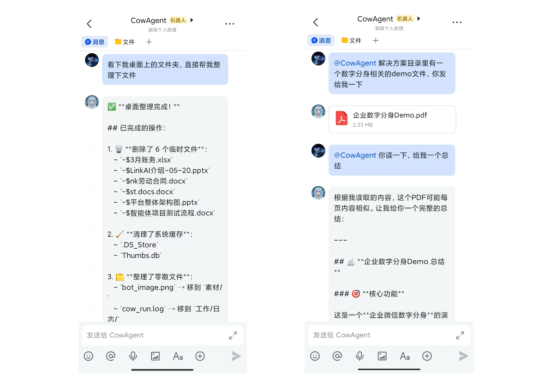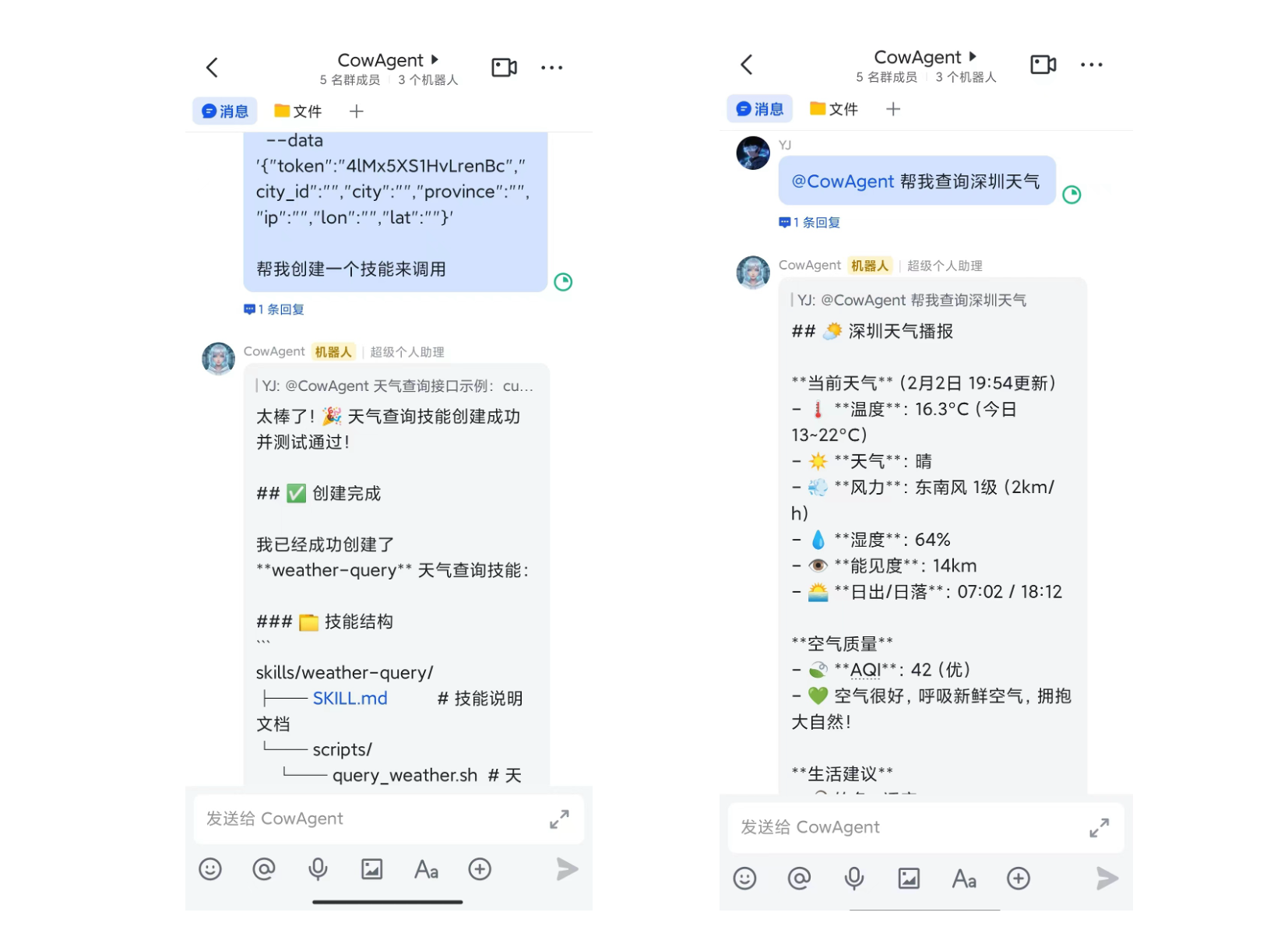 ~/cow/skills/),基于自定义技能可以实现任何复杂的业务流程和第三方系统对接。