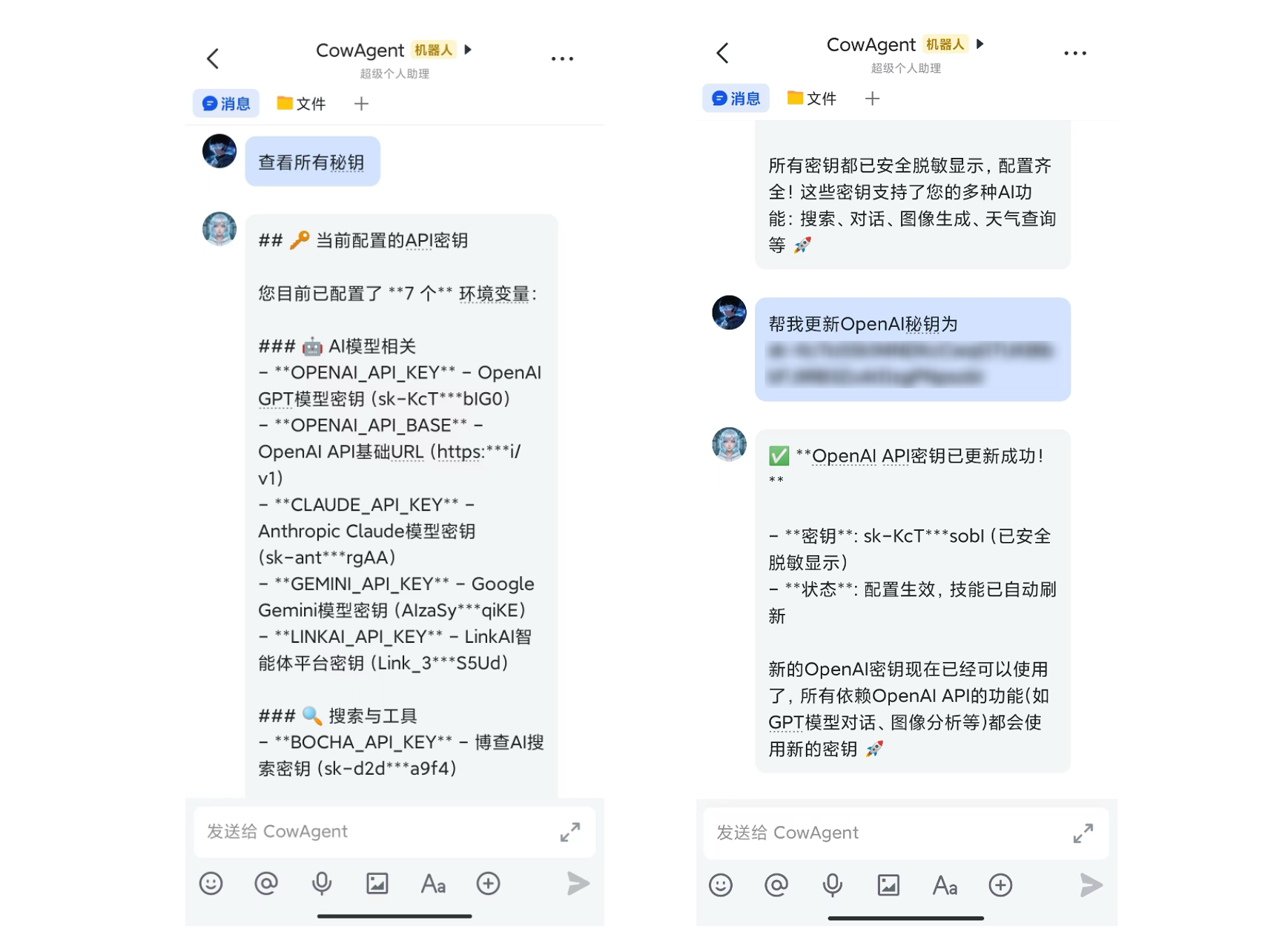 技能所需要的秘钥存储在环境变量文件中,由 env_config 工具进行管理,你可以通过对话的方式更新秘钥,工具内置了安全保护和脱敏策略,会严格保护秘钥安全: