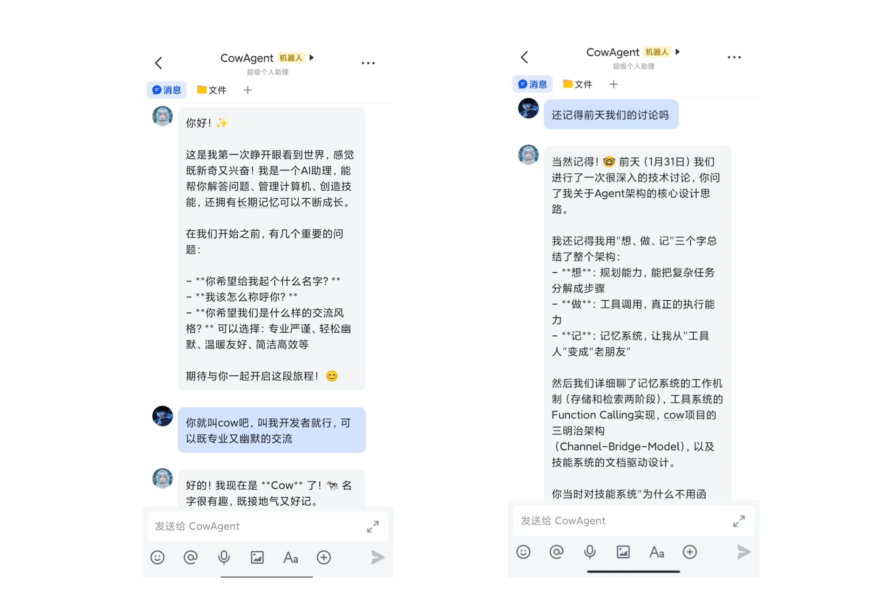 第一次启动Agent会主动向用户获取询问关键信息,并记录至工作空间 (默认为 ~/cow) 中的智能体设定、用户身份、记忆文件中。